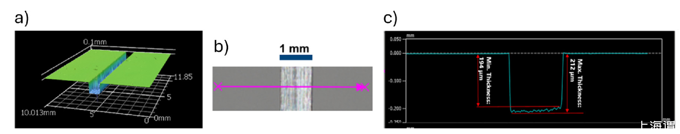 圖2、中間的劃痕到達合金基底。劃痕深度為200μm,寬度為1000μm,穿過涂層至裸合金表面。(a)輪廓測量圖;(b)涂層樣本的頂部光學照片;(c)帶劃痕樣本的橫截面輪廓。