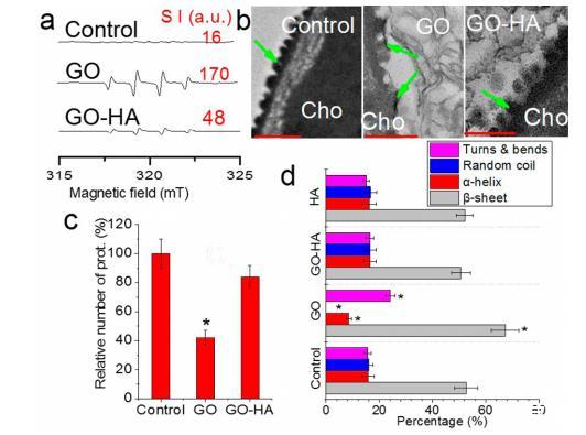 圖2.腐植酸(HA)對氧化石墨烯(GO)誘導卵殼損傷的影響。(a)通過電子順磁共振譜測定的羥基自由基生成量。S I表示電子順磁共振譜的信號強度。每個處理組包含40個胚胎。(b)GO/GO-HA與卵殼相互作用的透射電鏡圖像。(c)卵殼突起的半定量分析。相對數量是指納米材料處理組與對照組中突起數量的比值。綠色箭頭指示卵殼突起。每個處理組取三個胚胎的六張透射電鏡圖像進行分析。*表示在p<0.05水平上具有顯著性。(d)卵殼蛋白質二級結構的變化。每個處理組包含25個胚胎。*表示在p<0.05水平上具有顯著性,n=3。Cho:卵殼;GO:100 mg/L氧化石墨烯;HA:10 mg/L腐植酸。