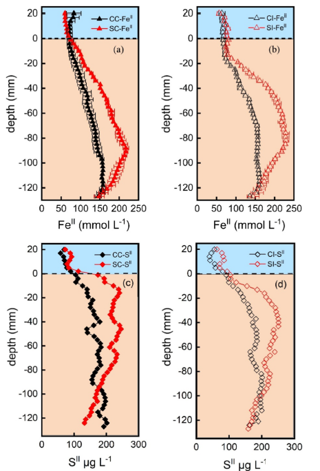 圖2、CDET-FeII(a-b)和CDGT-S-II(c–d)在土壤中的垂直分布情況。CC:持續淹水條件下控制土壤;SC:持續淹水條件下高硫酸鹽含量土壤;CI:間歇性淹水條件下控制土壤;SI:間歇性淹水條件下高硫酸鹽含量土壤。