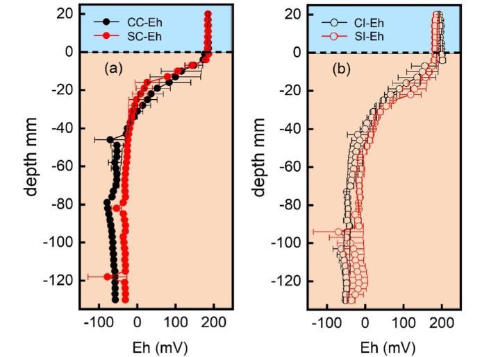 圖1、對照土壤和硫酸鹽改良土壤中Eh的垂直分布情況,(a)持續淹水處理,(b)間歇性淹水處理。CC:持續淹水條件下對照土壤;SC:持續淹水條件下高硫酸鹽含量土壤;CI:間歇性淹水條件下對照土壤;SI:間歇性淹水條件下高硫酸鹽含量土壤。
