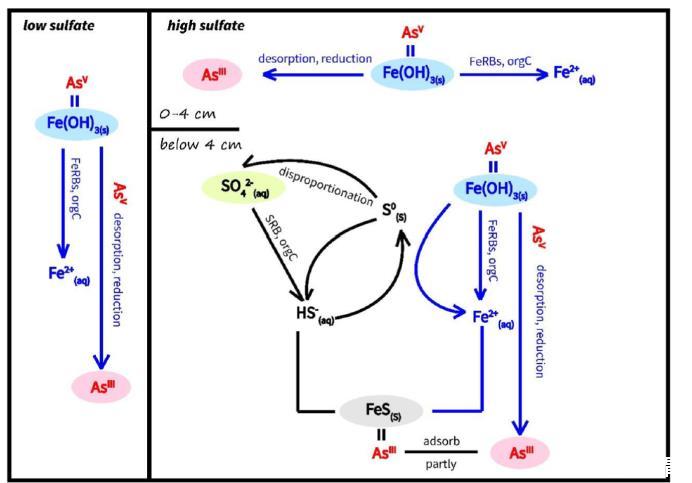 我們的研究結果表明,在持續水淹條件下,高硫酸鹽濃度會促使土壤剖面近表面(靠近土壤-水界面)的三價砷向上方遷移(約0-2厘米),而在厭氧區域(低于4厘米),硫酸鹽通過增強鐵和硫還原菌的活性,促進FeIII和SO42的還原為FeII和SII,從而抑制了三價砷的遷移。隨后的FeS沉淀會吸附砷,從而使三價砷的可用性降低了40%。此外,在這個宏系統實驗中,連續和間歇性灌溉條件下砷的遷移差異僅在近地表的0-2厘米層中顯現出來,而在2厘米深度以下觀察到的砷分布情況則較為相似。本研究為不同氧化還原條件和硫酸含量下土壤深度內的砷遷移和轉化機制提供了見解。在灌溉條件下,高濃度硫酸會增加近地表0-2厘米層中的砷III的遷移性,而間歇性灌溉則會降低其遷移性。這些發現為高硫酸土壤中的砷污染修復策略提供了指導。建立了精細尺度的砷循環概念模型。