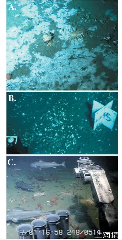(A) 覆蓋微生物墊的沉積物;(B) Vesicomya (Calyptogena) pacifica 聚集群;(C) 非滲漏沉積物。