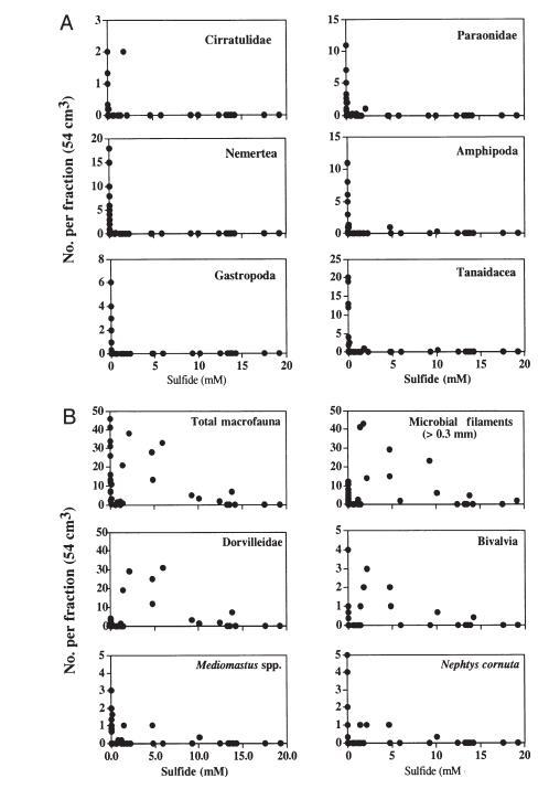 本研究中硫化物與動物豐度之間的典型關系是L形的,在零硫化物水平下有一系列密度,在較高硫化物水平下密度為零或接近零。這種"L形"模式在所有環境中都觀察到,適用于cirratulid和paraonid多毛類、紐形動物、端足類、tanaids和腹足類。多毛類Nephtys cornuta和Mediomastus spp.表現出輕微的硫化物耐受性;在1至10 mM硫化物濃度下觀察到低密度。總大型動物、氧化硫化物絲狀細菌、dorvilleid多毛類和雙殼類(主要是Vesicomya pacifica)的計數在中等硫化物水平(1至5 mM)下表現出最高密度,在5至14 mM硫化物下密度較低。蛤床巖心中的許多分類群似乎棲息在沉積柱的上部0至5厘米,那里的硫化物濃度接近零。