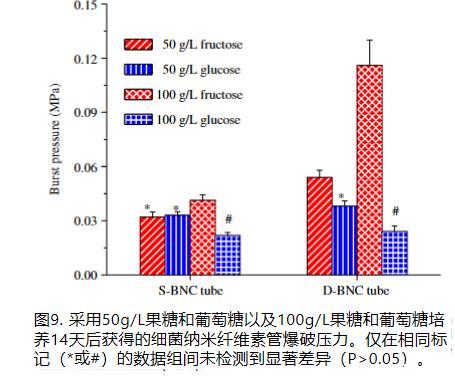 管爆破壓在一定程度上表明了圓周方向的強度。如圖9所示,所有管均能承受人體正常血壓(0.012-0.019 MPa,90-140 mmHg26)。與拉伸強度不同,BNC管的爆破壓與BNC產量的關系不明確。用100 g L-1果糖獲得的D-BNC管的爆破壓(0.116±0.014 MPa)比用50 g L-1果糖的D-BNC管大約2.2倍,這可能歸因于更高的BNC產量。盡管所有最終的S-BNC產量相似,但用100 g L-1果糖的S-BNC管的爆破壓比用50 g L-1果糖的S-BNC管大28%(0.041±0.003 MPa對比0.032±0.003 MPa)。較高的果糖濃度導致較高的爆破壓。有趣的是,用50 g L-1葡萄糖制備的BNC管的爆破壓大于用100 g L-1葡萄糖制備的管,盡管用100 g L-1葡萄糖的BNC產量更高。然而,在相同葡萄糖濃度情況下,S-BNC管和D-BNC管之間未檢測到顯著差異(P>0.05)。管壁中不均勻的纖維分布可能導致不同的薄弱點,這應對爆破壓產生決定性影響。