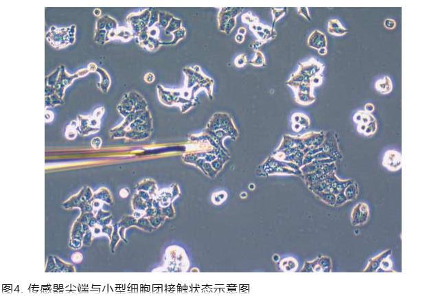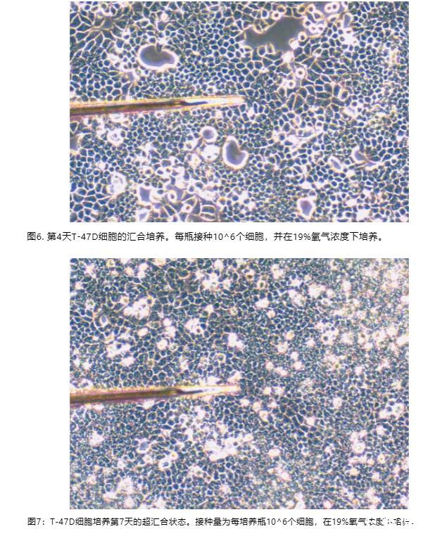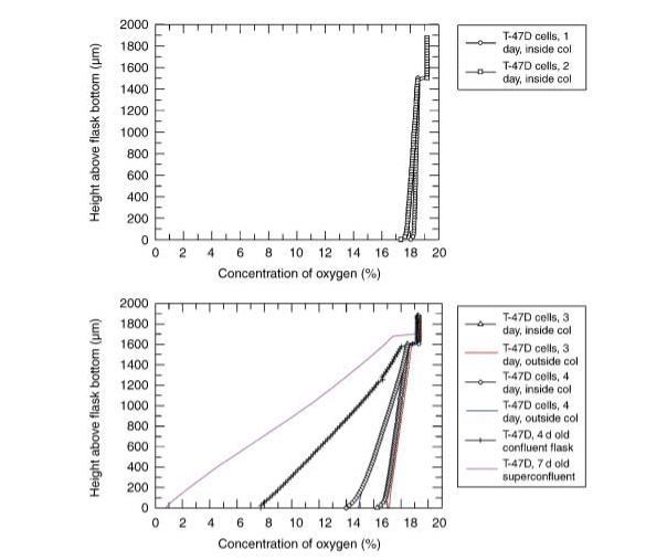 圖3顯示了讀數(shù)直至極低氧張力下的線性響應(yīng)。圖4是傳感器尖端精確接觸瓶底細胞的照片。圖5顯示了在第0天于25平方厘米瓶底接種50萬個細胞后第1、2、3和4天,以及接種100萬個細胞后第4和7天的氧分布(即氧張力隨瓶底上方高度的函數(shù)關(guān)系)。第0天接種50萬個細胞的培養(yǎng)物到第4天時為亞匯合狀態(tài),并在瓶底均勻分布,細胞集落樣組裝之間存在小的開放區(qū)域(圖6)。接種100萬個細胞的培養(yǎng)物到第5天時肯定已匯合,到第7天時趨于超匯合(圖7);作為腫瘤細胞系,T-47D細胞不受接觸抑制并不令人驚訝。在圖5中,可以看到分布最上部區(qū)域的偏移,此處傳感器尖端從氣相移動到首次接觸培養(yǎng)基表面。在分布的下部區(qū)域,對于第3和第4天,可以看到當測量尖端接近瓶底細胞集落之間(即開放區(qū)域)時的線性氧分布,但當從細胞集落表面進行測量時,分布呈曲線狀。這些結(jié)果證明了我們的傳感器可實現(xiàn)的測量靈敏度的范圍。