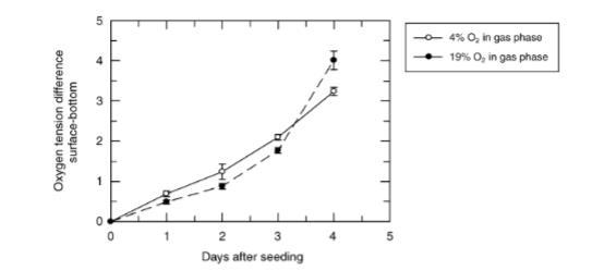 培養(yǎng)基表面和瓶底之間的氧張力差異受氣相張力的影響很小,如圖8所示。這是預(yù)期的,因為這些培養(yǎng)物中的細胞周圍氧張力始終保持在完全呼吸所需水平(約0.1%O2)以上。然而,圖8表明差異更高,因此,在19%氧氣中培養(yǎng)4天后,梯度變得比在4%氧氣氣氛中更明顯一些。這可能與細胞集落周圍的局部梯度比瓶內(nèi)較高處的整體梯度更顯著有關(guān)。如果局部梯度變化很大,這可能表明在4%O2氣氛下培養(yǎng)4天后氧氣獲取不足,而在19%O2下培養(yǎng)4天后則沒有這種缺乏。