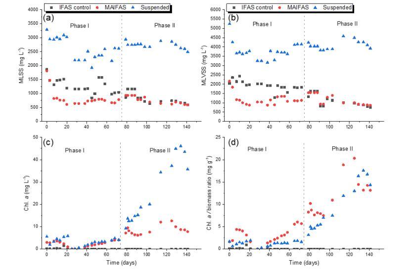 圖3-3.(a) MLSS ,(b) MLVSS ,(c)葉綠素a,(d)葉綠素a/生物量比在 IFAS 對照、 MAIFAS 對照和懸浮藻對照SBRs中150天內的變化。生物量樣本在好氧階段采集。機械曝氣在第一階段好氧序列期間應用于所有反應器。僅在第二階段好氧序列期間對 MAIFAS 和懸浮反應器施加光照。