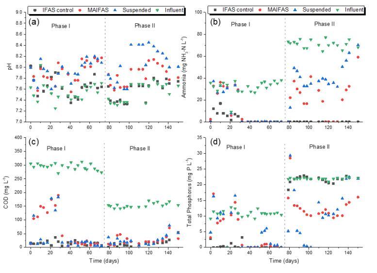 圖3-2. (a) pH, (b) 氨氮, (c) COD 和 (d) 總磷(TP)在IFAS對照、MAIFAS和懸浮藻類對照SBRs中150天內的出水變化