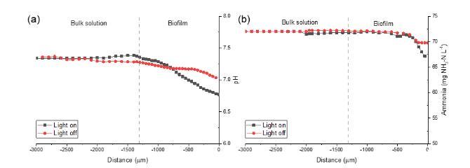 圖3-7. (a) pH 和 (b) 氨氮微剖面,顯示MAIFAS生物膜在76.2 μmol m?2 s?1白色熒光燈光照和黑暗條件下生長140天后的情況。參考線代表生物膜厚度。