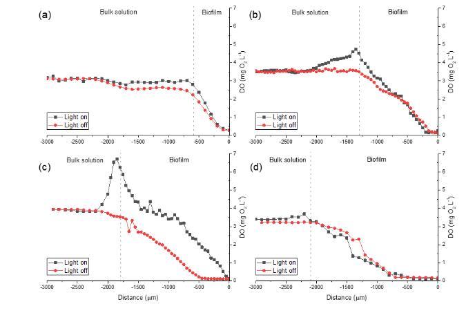 圖3-5. MAIFAS生物膜在76.2 μmol m?2 s?1白色熒光燈光照和黑暗條件下的DO微剖面,生長時間為(a) 40天, (b) 80天, (c) 130天 和 (d) 150天。參考線代表隨時間變化的生物膜厚度。