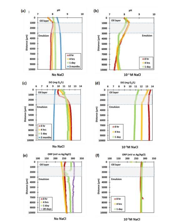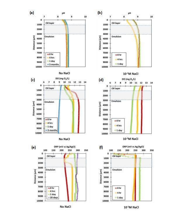 微電極油包水乳液表征 使用微電極成功測量了化學微剖面,包括DO、pH和ORP剖面,用于乳液穩定性和化學性質的原位表征在微尺度。所有測量的微剖面在油水乳液混合物中多次連續測量可重現。微剖面乳液樣品顯示隨鹽度和表面活性劑類型變化。圖4-5(a)和(b)及圖4-6(a)和(b)顯示Triton X-100和SDS表面活性劑乳液樣品在無(僅DI水)和有NaCl(0.1 M)下的時空pH變化。對于所有無NaCl的條件,pH隨時間增加,可能由于未知油添加劑隨時間擴散;然而,這種pH增加在SDS乳液中更明顯。似乎鹽度存在增加了油添加劑的質量傳輸;然而,體相中pH增加的速率隨鹽度增加減慢。這是由于SDS乳液隨鹽度增加直徑增加和表面積減少(圖4-3)。