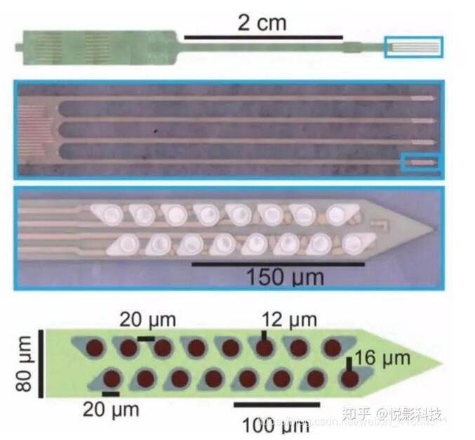 還有研究者在神經微電極上集成LED光刺激位點,可實現對神經信號進行光刺激的同時采集神經電信號[6],如下圖所示。