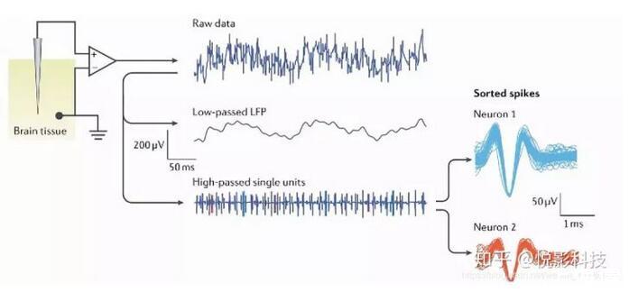 在神經科學領域,研究者往往需要采集動物腦內的神經電生理信號,即神經元放電產生的動作電位,或神經核團眾多神經元電活動形成的局部場電位。比如說,在動物執行工作記憶任務時采集動物前額葉皮層的神經電信號,以此來研究工作記憶的神經機制。那么問題來了,如何才能采集或檢測到動物腦內的神經電信號呢?這里研究者就需要借助于神經微電極,神經微電極采集顱內神經電信號的示意圖如下所示。