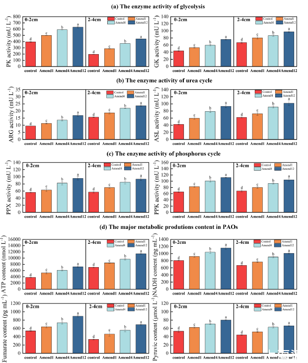 圖3、死亡藻類對沉積物 0 - 2 厘米范圍內微生物代謝中糖酵解(a)、尿素循環(b)、磷循環(c)以及主要代謝產物含量(d)(在微生物氨氧化作用中)在 80 天培養后的關鍵酶活性的影響(在糖酵解中,GK 和 PK 分別為葡萄糖激酶和丙酮酸激酶;在尿素循環中,ARG 和 ASL 分別為精氨酸和精氨琥珀酸裂解酶;在磷循環中,PPX 和 PPK 分別為多聚磷酸酶和多聚磷酸激酶)。結果以與每個對照組相比的百分比形式呈現,平均值并標有標準誤差(n = 3)。不同的字母表示存在顯著差異。