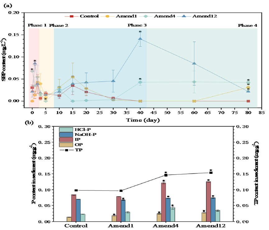 圖2、在為期 80 天的培養過程中,對照組、 Amend1 組、 Amend4 組和 Amend12 組上層水中的 SRP 濃度持續變化(a),以及對照組、 Amend1 組、 Amend4 組和 Amend12 組培養結束時 0 - 2 厘米沉積物中的不同磷組分(OP、IP、HCl-P、NaOH-P、TP)的含量變化(b)。每個樣本的數值以平均值及標準誤差的形式呈現(n = 3),誤差條上方的星號表示存在顯著差異(p < 0.05)。