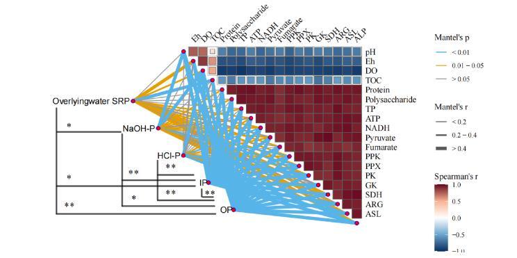 圖5、對 P 分子與沉積物性質之間關系的層狀分析。該相關性熱圖展示了死亡藻類沉積后不同物理、化學和生物因素之間的相關性,左側的線條表示水體和沉積物中各種磷濃度與 SWI 的物理、化學和生物因素之間的相關程度及顯著性。通過皮爾遜分析對水相沉積物系統中不同磷形式之間的相關關系進行了研究,顯著性以標記形式表示。