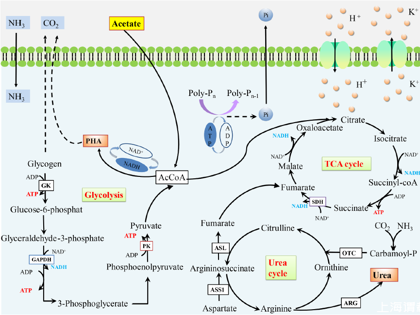 圖4、在PAO菌群的P循環過程中,典型微生物葡萄糖代謝(糖酵解和三羧酸循環)以及尿素循環的示意圖。PHA(蛋白質激素結合劑)(聚羥基脂肪酸酯)、GK(葡萄糖激酶)、PK(丙酮酸激酶)、GAPDH(甘油醛-3-磷酸脫氫酶)、SDH(琥珀酸脫氫酶)、OTC(鳥氨酸轉氨甲酰酶)、ASL(精氨酸琥珀酸裂解酶)、ARG(精氨酸)以及 ASS1(精氨酸琥珀酸合酶 1)均在該圖中有所展示。