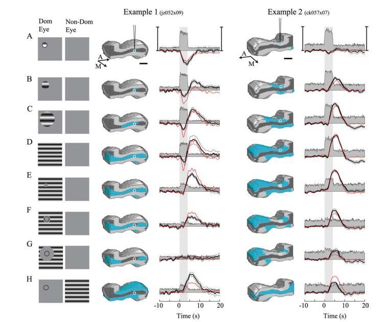 圖2. 氧反應與LGN神經活動空間模式具有協同性。A-H展示了LGN中兩個示例記錄位點的神經測量與氧測量的刺激反應配對。首列呈現主導眼與非主導眼的漂移光柵刺激,A、F、G、H中的虛線圓表示感受野(RF)的位置與尺寸。第二和第四列分別代表左右LGN矢狀切面的透視視圖,由刺激引發的模擬神經激活模式以藍/綠色呈現,其依據包括刺激參數、RF位置及貓LGN的視網膜拓撲圖譜。每個圖標中A層與C層(淺色)、A1層(深色)以及內側膝狀體核(灰色)均有標示,A和M分別表示前側與內側方向,水平標尺為1毫米。圖標中的白圈代表微電極傳感器位置。第三和第五列中,每個多單元神經反應(灰色填充)與氧反應(黑色)分別代表24次和32次試驗的平均值,虛線表示±1標準誤,紅線代表通過我們建立的神經活動模式與組織氧變化關系模型對氧反應的擬合。垂直標尺:示例1左側129峰/秒,右側9%氧變化;示例2左側80峰/秒,右側16%氧變化。