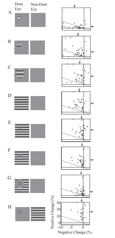 圖3. 首次LGN實驗的群體數據。A-H,刺激圖標(左側)與圖2中的圖標相同。每個散點圖(右側)對應于其左側圖標所描繪的刺激條件,并顯示所有記錄位點觀察到的氧含量變化。每個點代表特定記錄位點平均氧反應的最大負向(橫軸)與正向(縱軸)變化量。最大負向和正向變化分別限定在刺激開始后的前5秒和10秒內。部分超出圖表范圍的數據點(負向變化最高達-15%,正向變化達50%)已重新縮放至邊界以便顯示。各圖中的虛線表示氧含量正負變化相等的分界線。箭頭指示各分布的平均值。