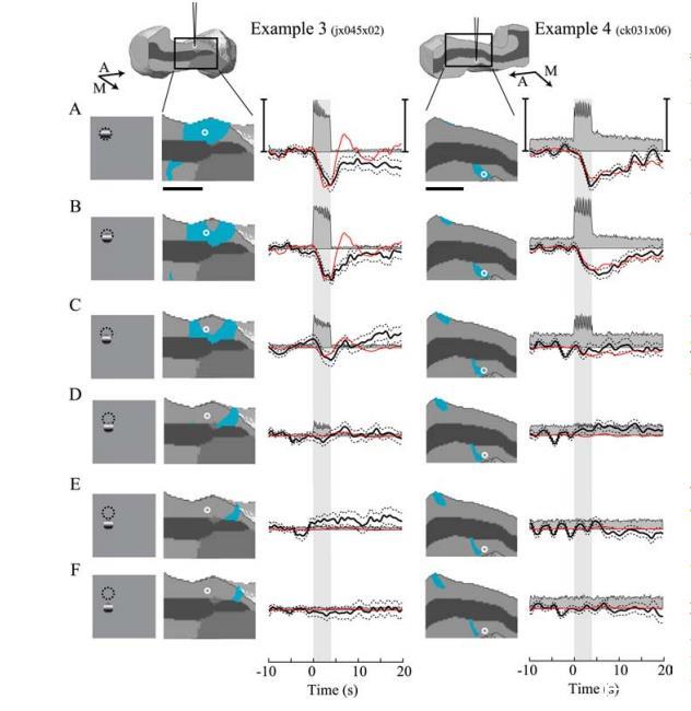 為了檢查負向氧響應的空間特異性,我們改變了小視覺刺激相對于RF的位置。圖4顯示兩個示例記錄位點的刺激-響應對。與第一個實驗一樣,以RF為中心的小光柵刺激引起單相負向氧響應,沒有后續的正向成分。隨著刺激被逐漸定位得離RF中心更遠,活動的位點相對于電極向前移動。負向氧響應的幅度隨著活動焦點遠離電極尖端而減小。這一結果表明,負向氧響應很好地局限于神經活動的部位。