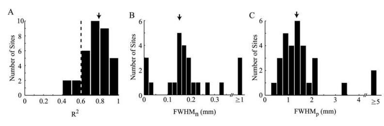 圖9.負(fù)向與正向氧響應(yīng)成分的空間特性。 A、LGN記錄位點(diǎn)群體(n=34)的擬合優(yōu)度(R)值。每個(gè)記錄位點(diǎn)的平均氧響應(yīng)(每種刺激條件對(duì)應(yīng)1個(gè))采用圖7所示模型進(jìn)行擬合。使用四個(gè)自由參數(shù)(σn、σp、gn和gp)同時(shí)擬合所有氧響應(yīng)。虛線代表擬合優(yōu)度閾值,僅當(dāng)R值高于此閾值時(shí),擬合所得參數(shù)才會(huì)在下文展示。B、C、根據(jù)公式 15(見(jiàn)結(jié)果部分)通過(guò) σn 和 σp 計(jì)算得出的負(fù)向(B)與正向(C)點(diǎn)擴(kuò)散函數(shù)(PSF)的估計(jì)半高全寬(FWHM)值。每個(gè)直方圖展示L GN記錄位點(diǎn)群體參數(shù)值的分布情況。 B圖中排除了組織氧含量無(wú)顯著負(fù)向變化(p<0.001, t檢驗(yàn))的記錄位點(diǎn)數(shù)據(jù)。負(fù)向與正向PSF的平均值(箭頭標(biāo)示)分別為0.14±0.07毫米和1.35±0.6毫米。群體平均值計(jì)算時(shí)已排除右側(cè)極端異常值。