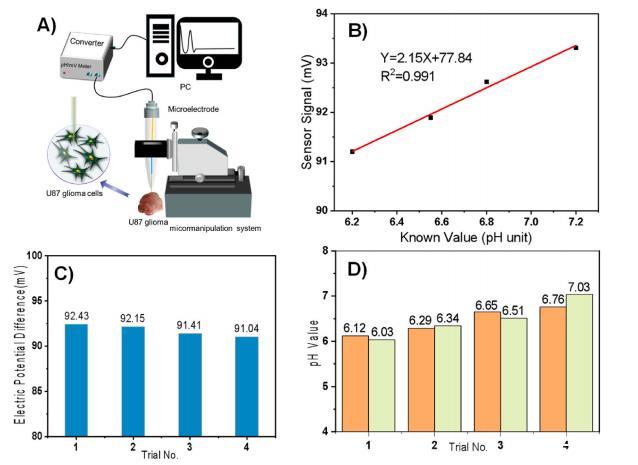 圖5. A) 微操作平臺系統(tǒng)。B) 微電極pH檢測方法的標(biāo)準(zhǔn)曲線。C) 使用微電極測量時(shí),小鼠膠質(zhì)瘤細(xì)胞不同位置對應(yīng)的電位差。D) 通過PH微電極測量的小鼠膠質(zhì)瘤不同位置pH值與SERS方法測量結(jié)果的對比。