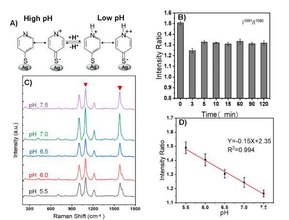 圖3. A) 吡啶分子結(jié)構(gòu)在酸性和堿性條件下變化的示意圖。B) 不同響應(yīng)時(shí)間下獲取的相同pH條件下4- MPY 兩個特征峰(I1093/I1584)的比值。C) 4- MPY 在不同pH緩沖液中響應(yīng)的SERS光譜。D) 4- MPY 兩個特征峰(I1093/I1584)的比值及其pH值與線性擬合曲線。