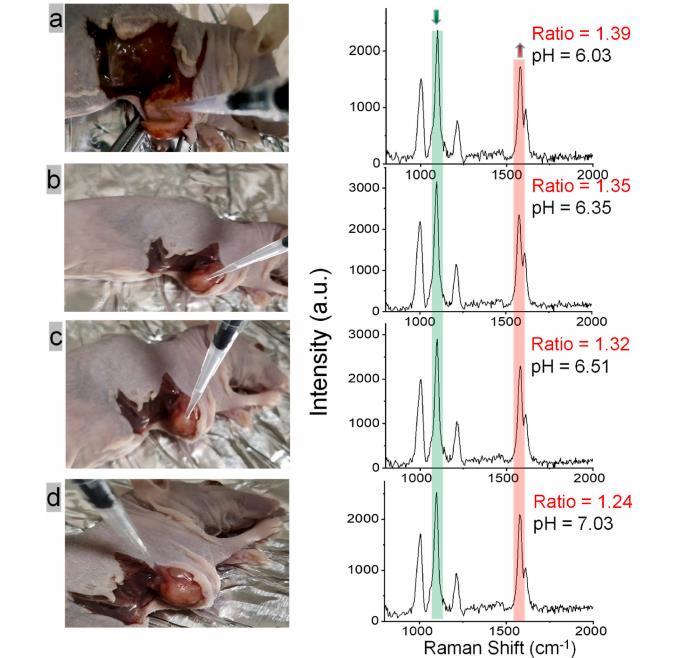 將上述SERS芯片用于膠質(zhì)瘤組織間液的測量。首先,通過細(xì)胞懸液植入法將U87膠質(zhì)瘤細(xì)胞懸液注射到胸腺切除小鼠的上肢腋下。培養(yǎng)14天后,獲得約1.0 cm3的膠質(zhì)瘤。在局部麻醉下,將小鼠異位膠質(zhì)瘤細(xì)胞完全剝離。為了收集小鼠膠質(zhì)瘤細(xì)胞微環(huán)境的局部pH值,將4.0 μL水滴滴在小鼠膠質(zhì)瘤細(xì)胞表面,以將組織間液提取到水滴中。10秒后,用移液器重新吸取,然后重新滴在SERS基底上進(jìn)行SERS測量。收集小鼠膠質(zhì)瘤的四個不同位置,并在每個位置測量10個SERS光譜。從結(jié)果中我們可以觀察到4-MPY具有很高的SERS活性,其信號在記錄的SERS譜圖中占主導(dǎo)。計(jì)算了I1091/I1580的比值,并獲得了相應(yīng)的pH值(圖4)。可以看出,膠質(zhì)瘤的局部微環(huán)境呈酸性。隨著測量位置接近腫瘤邊緣,腫瘤的pH值逐漸升高。因此,我們可以推斷該技術(shù)可用于確定腫瘤邊界。當(dāng)微環(huán)境的局部pH處于生理范圍(7.35~7.45)內(nèi)或大于此范圍時(shí),證明腫瘤尚未侵入該區(qū)域,手術(shù)中可以保留該區(qū)域組織。
