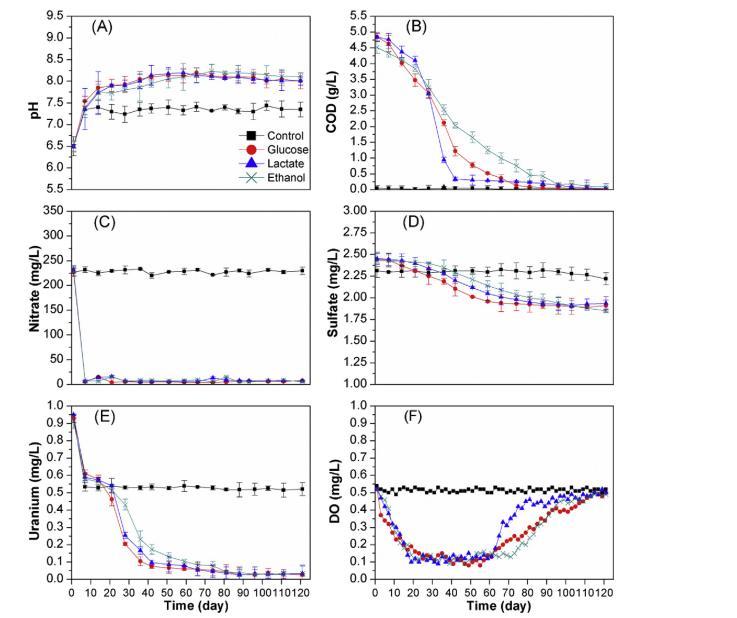 圖1. 培養期間微宇宙底部區域中(A) pH、(B) COD、(C) 硝酸鹽、(D) 硫酸鹽、(E) 鈾和(F) 氧溶解度的變化(初始濃度對應于第0天的濃度,所有數據點均為三次重復測量的平均值)。