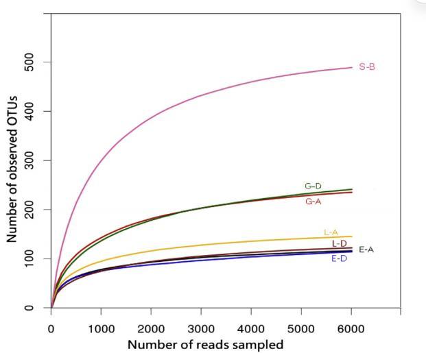 根據焦磷酸測序結果,計算了歸一化16S rRNA基因文庫的微生物群落豐富度和多樣性指數。根據數值大小,添加了電子供體的微觀體系的沉積物樣品中微生物群落豐富度的Chao和ACE指數排序如下:S-B > G-D > G-A > L-A > E-D > L-D > E-A。原始沉積物具有最高的微生物群落多樣性,但來自添加了電子供體的微觀體系的沉積物多樣性較低,這與已報道的結果一致。電子供體的添加可能對與U(VI)生物還原相關的微生物起到富集作用,導致與U(VI)生物還原無關的其他微生物比例相對下降。稀疏曲線顯示的微生物群落豐富度特征與Chao和ACE指數結果相同。