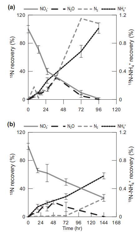 圖 3. 隨著時間的推移,15N 以 NO3、N2O、N2 和 NH4+(第二軸)的形式回收,用于處理 TN (a) 和 TLN (b)。 所有值均針對回收的 15NeNO3 進行標準化 時間 0 (n = 3)。