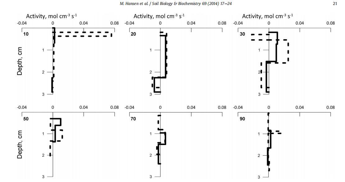 圖 2. TC 處理在 6 個時間間隔內(洪水后 10、20、30、50、70 和 90 小時)的 N2O 生產(正值)和消耗(負值)的模擬活動 (實線)和TN(虛線)。 < 0.0007 mol cm 3 s 1 的值未顯示。 對于治療 TL 和 TLN,參見 SI 圖 S7。