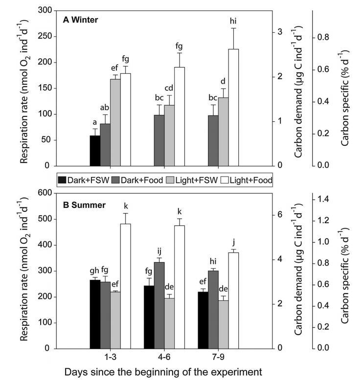 圖 2 呼吸速率,碳 每個人的需求率, 和碳特定需求 天 (nmol O2 ind-1 day-1, lg C ind-1 day-1 和 % day-1 分別)和標準 每次處理的偏差, 黑暗和過濾的海水 (黑暗+FSW),黑暗和食物 加成(暗+食物),光 暴露和過濾海水 (Light+FSW) 和 Light and 食物添加 (Light+Food),對于 一個冬天和一個夏天。 因為 技術(shù)問題,沒有結(jié)果 可用于第 4-9 天 Dark+FSW 中的治療 十一月。 對于所有碳特定需求結(jié)果, 不同的字母表示 之間的顯著差異 處理(單向方差分析, 迷幻劑; p \0.05)。 請注意 每個不同的 y 軸比例 季節(jié)