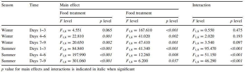表 1 每個時間間隔的 C 特定需求率的雙向 ANOVA,包括食物處理 (Food/FSW) 和光照狀態(tài) (Light/FSW) 暗)為主要因素