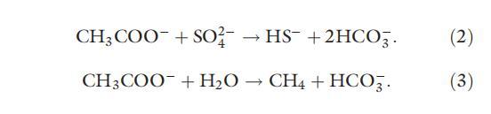 由于異化 Fe(III) 還原菌和其他微生物(氧化根還原劑或產甲烷菌)對同一電子供體的競爭,異化 Fe(III) 還原抑制微生物的氧化根還原和還原生產 (Lovley & Phillips, 1986a , 1987a; Chapelle & Lovley, 1992; Roden & Wetzel, 2003)。 乙酸鹽不僅可以被異化 Fe(III)-還原菌利用,如方程式 (1) 所示,也可以被氧化根還原劑和產甲烷菌利用,如下所示 (Lovley & Klug, 1986):