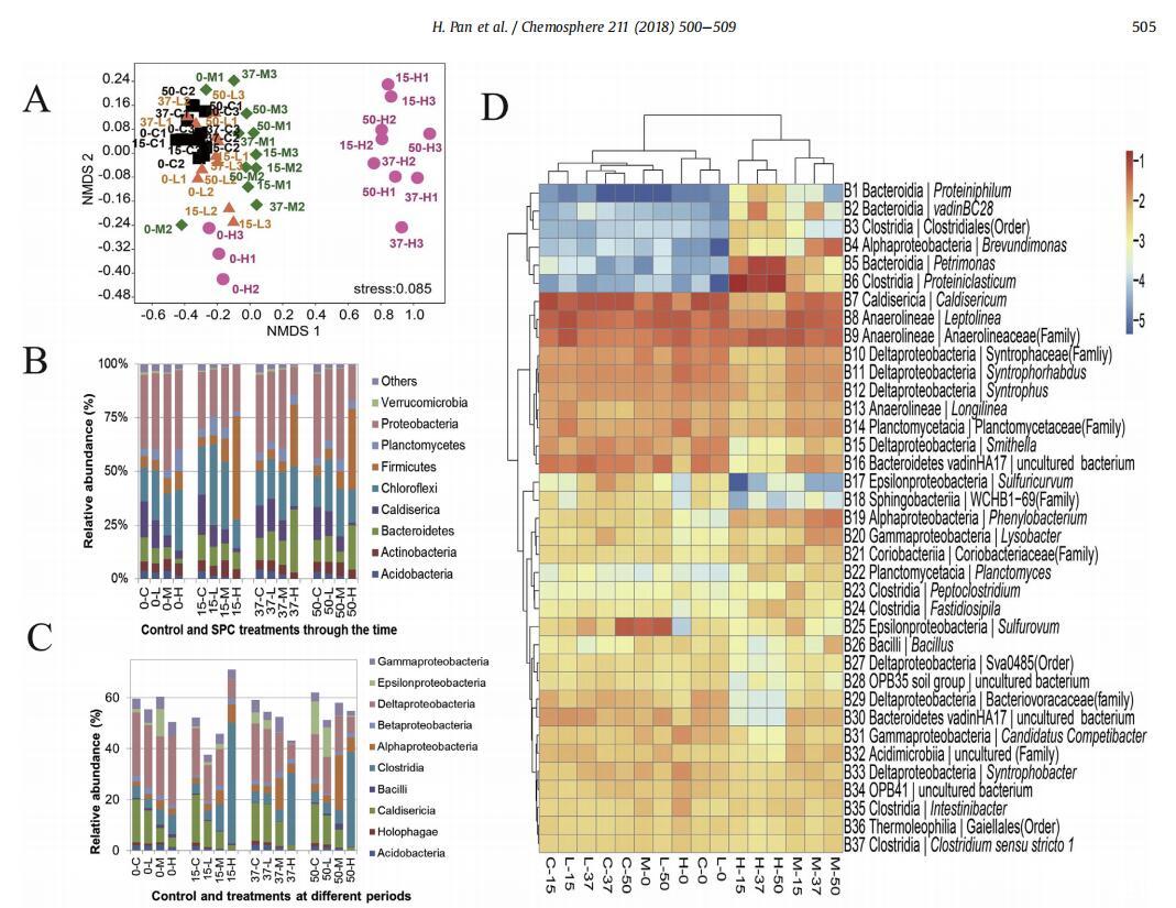 近年來,由于非培養(yǎng)方法的快速發(fā)展,微生物群落結構的研究受到了前所未有的重視。微生物群落在分類組成上表現(xiàn)出強烈的差異,而其代謝功能和性能可能保持不變(Louca和Doebeli,2017)。因此,徹底調查微生物群落對添加SPC的反應需要對分類組成和功能分析進行共同解釋。獲得的阿爾法多樣性結果(表1)表明,在SPC的H劑量下,微生物群落的異質性可能會下降。獲得的分類學水平結果表明,在SPC的H劑量下顯著增加的微生物主要屬于厚壁菌門(其中許多產生內孢子(Onyenwake et al.,2004)),專性厭氧類梭狀芽孢桿菌(川崎等,1998年)、發(fā)酵類Petrimonas屬(Grabowski等,2005年)和蛋白水解類Proteinicreticum屬(Zhang等,2010年)。此外,在M劑量SPC下增加的微生物主要屬于α蛋白細菌類(在有機富集沉積物中對有機物的分解和同化具有重要作用的細菌(Kunihiro等人,2011))和異養(yǎng)菌屬Brevundimonas(Tsubouchi等人,2014)。相比之下,嗜酸性細菌門、Caldisericia類(硫代硫酸鹽還原菌(Mori et al.,2009))、Holophagae(其成員能夠厭氧降解芳香化合物(Anderson et al.,2012))、硫氧化菌屬Sulfuricurvum(Haaijer et al.,2008;Kodama和Watanabe,2004),鞘氨醇桿菌科的一個屬(Schmidt et al.,2012)是SPC M和H劑量下最脆弱的微生物。受影響的微生物群落在更高的分類水平(如類群或門水平)表現(xiàn)出與屬水平相似的重疊和分類豐度,這表明SPC的加入可能會影響特定狹窄分支內的特定屬。此外,在整個實驗期間,所有這些效應很難自發(fā)恢復到原始狀態(tài)。關于功能性基團,獲得的結果(圖3E和表S4)表明,在所有試驗期間,在M和H劑量的SPC下,最豐富的基團沒有改變,對發(fā)酵、化學異養(yǎng)、尿解和需氧化學異養(yǎng)的影響都是積極的。然而,在試驗后期,H劑量對硫酸鹽呼吸和硫化物呼吸的影響為負。這些發(fā)現(xiàn)表明,微生物群落的分類組成和功能組對添加SPC的反應均表現(xiàn)出劑量依賴性偏差。這表明在生態(tài)工程中應考慮SPC的劑量。