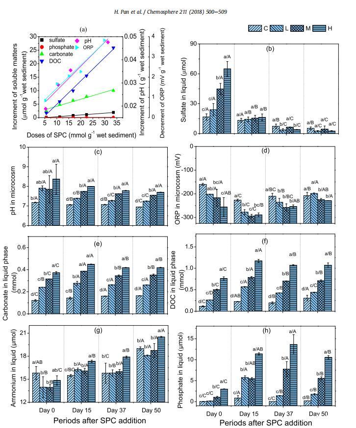 基于這些結果,對于以下結果,使用對照(C)、低(L)、中(M)和高(H)微宇宙來表示空白對照和三劑量SPC(11.2,22.4,和33.6毫摩爾SPC G-1濕沉積物)。圖1b-h顯示加入SPC后微觀環(huán)境變量的趨勢不同。首先,pH值在第15天下降,之后保持穩(wěn)定。第二,ORP在第15天下降,之后緩慢上升。第三,碳酸鹽和DOC在第15天增加,但在第37天顯著減少,之后保持穩(wěn)定。此外,在使用SPC處理的所有微觀世界中,磷酸鹽在第15天顯著增加,而在L水平處理中減少,在第37天M和H微觀世界中增加。然而,添加SPC后的硫酸鹽在第15天降至C微觀結構的水平,在第50天降至C微觀結構的值以下;在第15天,L、M和H微觀結構中的銨含量超過了C微觀結構中的銨含量。