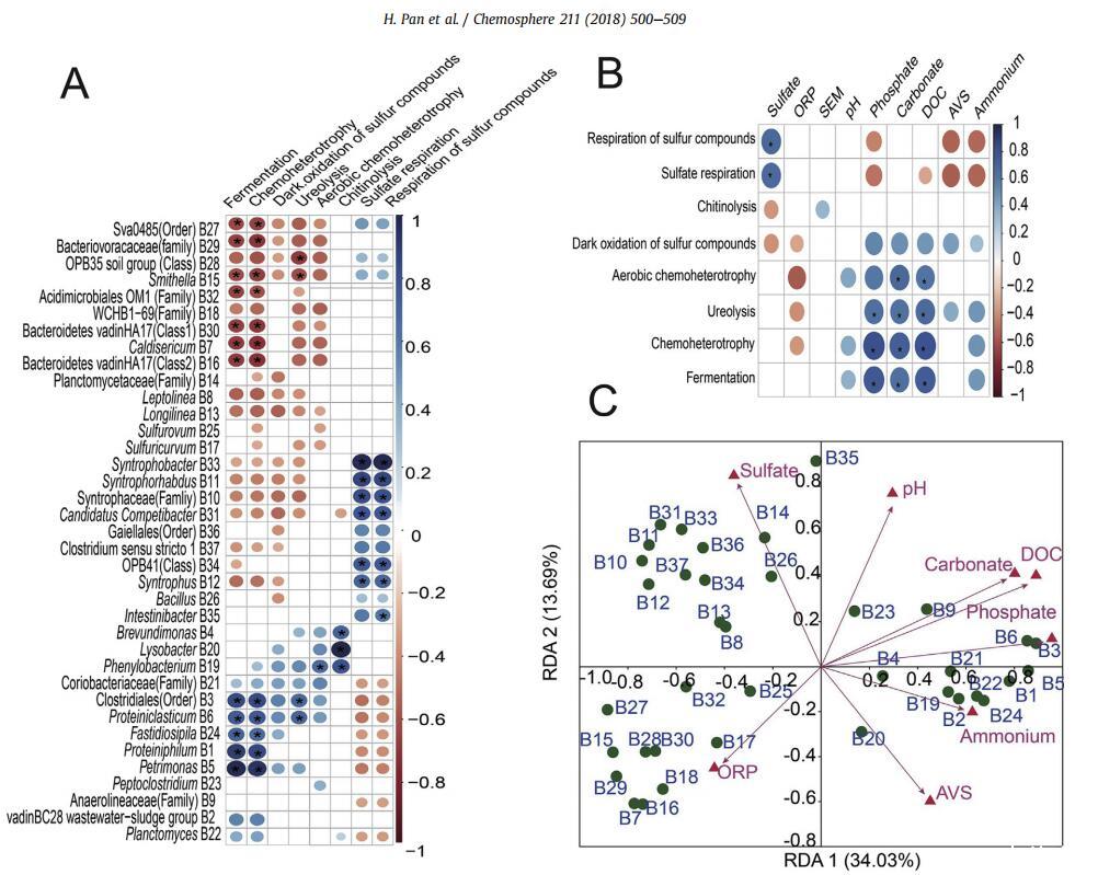 先前的研究報告了地球化學成分變化與群落結構變化之間的顯著相關性(Jorgensen等人,2012年;Louca等人,2017年)。在本研究中,改變的環(huán)境變量、顯著增加的微生物組和功能性微生物的優(yōu)勢之間的強相關性(圖4)表明,添加SPC后,DOC、碳酸鹽和磷酸鹽是主要變量,富集了特定的微生物,脆弱的微生物組群歸因于ORP。然而,除了顯著增加的微生物與上述功能微生物之間的相關性外,之前的研究報告稱,Petrimonas是產氫細菌(Sun等人,2015),脫氮系統(tǒng)中的蛋白碎屑菌通常非常豐富(Wang等人,2015;Yang等人,2015),柴油中發(fā)現(xiàn)了Brevundimonas(Wang等人,2016)。此外,雜項組的代謝活動增強(圖2b)。很可能,增加的屬可能具有不同的代謝能力,并可能參與沉積物修復中污染物的后續(xù)生物修復。
