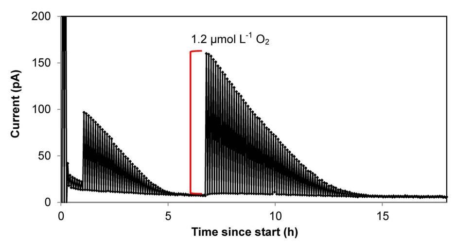 圖3。與沿海海水孵育的STOX傳感器中氧氣消耗的時間過程。來自站點2水孵化的STOX傳感器數據示例(Marselisborg Marina,2011年9月)。僅繪制每個循環期間的最小和最大讀數,并用線連接。最大和最小讀數之間的差值用作O2濃度的測量值。信號的初始振幅(11 pA)對應于200 nmol-1瓶中的O2濃度。如紅線所示,在1h(2ml,600nmol-1)和6.7h(4ml,1200nmol-1)注射空氣飽和水。內政部:10.1371/期刊。波內。0105399.g003