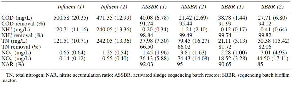表1顯示了兩種SBR的污染物去除性能。ASSBR和SBBR的COD去除率均在91%以上。在這兩個反應器中,進水中幾乎所有的NH4+-N都被完全去除,去除率為98–99%。然而,兩種反應器的TN去除效率存在明顯差異,ASSBR和SBBR的TN去除效率分別為66.02–66.50%和81.72–82.06%。在兩個反應器的好氧階段結束時,NAR的85%以上出現了明顯的亞硝酸鹽積累。在相同進水負荷下,ASSBR的NO2-N濃度顯著高于SBBR。