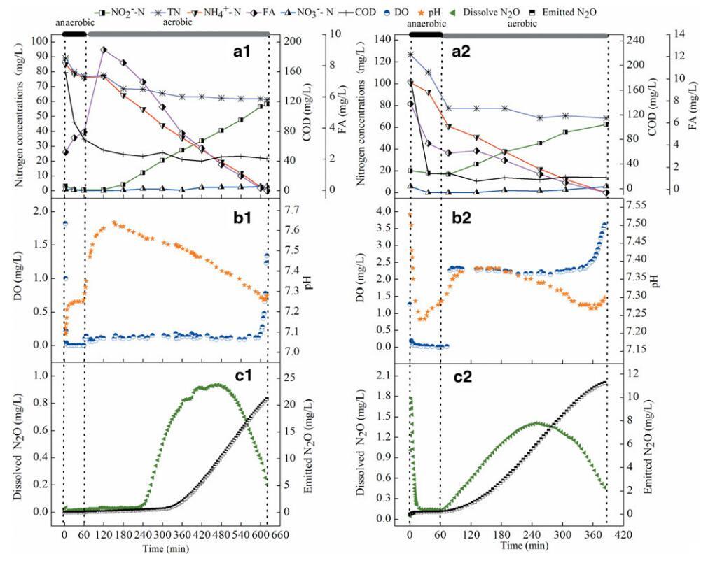 高氮負荷下的污染物去除特性。圖3(a1、a2、b1、b2)顯示了進水COD和NH4+-N的典型循環中參數的時間過程分別為500 mg/L和240 mg/L。COD、TN、NH4+-N、NO3-N、NO2-N、FA和DO濃度和pH值的變化趨勢與低氮負荷下的變化趨勢一致。說明上述各參數的變化規律在不同氮負荷下具有重復性。