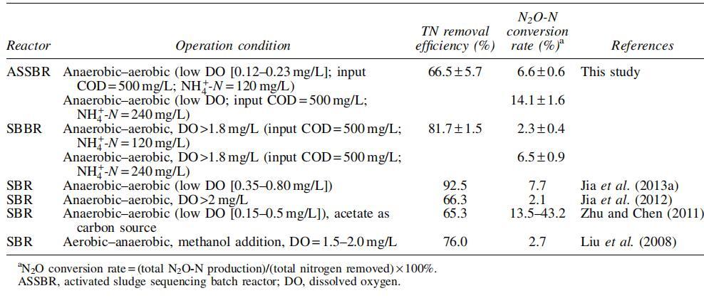 表2顯示了近期文獻中處理廢水的不同操作條件下的TN去除效率和N2O轉化率。當輸入NH4+-N濃度為120mg/L時,ASSBR和SBBR的N2O轉化率分別為6.6%±0.6%和2.3%±0.4%。當進水NH4+-N濃度為240mg/L時,ASSBR和SBBR的N2O轉化率分別為14.1%±1.6%和6.5%±0.9%。結果表明,在相同氨負荷下,SBBR的N2O轉化率為ASSBR的1/3-1/2。主要原因如下。