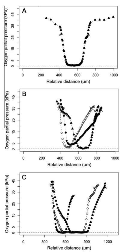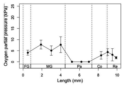 圖2。臺灣褐飛虱腸道系統(tǒng)的軸向氧分布。氧氣數(shù)據(jù)記錄在一個腸道隔室的中心。剖面圖上的每個點(diǎn)代表五次單獨(dú)測量的平均值±SE。
