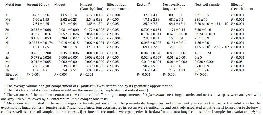 除了氧氣、pH值、氧化還原電位和氫氣是白蟻腸道系統(tǒng)中重要的物理化學(xué)條件外,一些金屬離子確實(shí)對維持食品加工過程中的一些關(guān)鍵代謝以及多種腸道微生物群的棲息地至關(guān)重要(Kramarz,1999)。從目前的研究中可以清楚地看出,臺灣褐飛虱在其腸道系統(tǒng)以及培養(yǎng)的真菌梳子中以高濃度選擇性地積累了幾種金屬離子。這些金屬離子可能與木材解構(gòu)過程以及一些內(nèi)共生和外共生微生物的功能有關(guān)(Mills等人,2009年;Stewart等人,2011年;Yoshimura等人,2002年)。