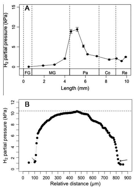 作為白蟻腸道共生體代謝的中心中間體,還記錄了臺灣白蟻腸道系統(tǒng)的軸向和徑向氫濃度分布。氫微電極測量顯示,在各種腸道腔室的中心,氫分壓范圍很廣(圖6A)。在前腸,氫分壓始終低于檢測限。對于中腸,氫壓分別在前腸、中腸和后腸區(qū)域顯著增加。氫在后腸前腹部積聚,導(dǎo)致最高氫分壓為9.4±0.5 kPa。然而,從前腹部到中腹部的比例急劇下降,在后腹部和結(jié)腸中也有類似的趨勢。除前腹部外,只有直腸有氫積聚,觀察到相對較高的氫分壓約為2.5±0.1 kPa。
