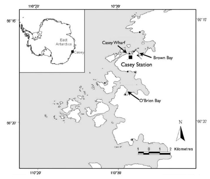 圖1南極洲凱西站凱西碼頭、布朗灣和奧布萊恩灣三個現場的位置