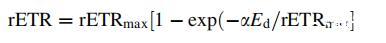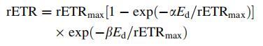 rETRmax表示無光抑制時的最大潛在rETR。a是飽和開始前光照曲線的初始斜率,表示光照利用效率。Ed是輻照度(通式為400–700 nm)。b是表征光抑制的參數。在光線曲線中沒有光抑制的情況下,b=0,函數變為: