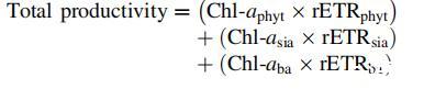 浮游植物、海冰藻類和底棲藻類的相對貢獻如McMinn等人(2005)所述,即通過將各成分的面積(m-2)chl-a濃度乘以其在最大環境輻照度下的各自rETR來計算。