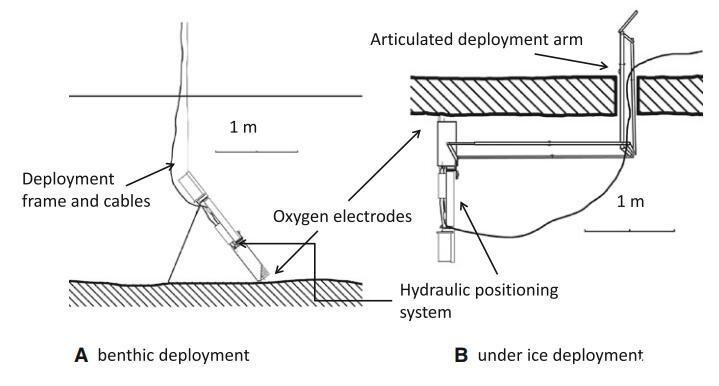 圖2氧氣微電極部署設備。相同的液壓微電極定位系統用于底棲(a)和冰下(b)部署。在冰下部署模式下,光、氧溫度和鹽度傳感器位于一起。在底棲部署期間,光傳感器保持在沉積物表面上方。視頻設備位于水工建筑物內