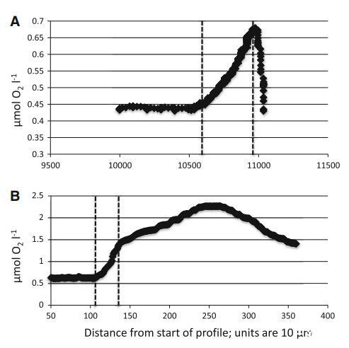 圖3從海冰(2004年12月2日下午2:44棕色海灣)和b底棲藻類群落(2004年12月1日下午2:14凱西碼頭)的氧微電極測量中獲得的擴散邊界層(DBL)的氧剖面示例。垂直刻度表示擴散氧通量,水平刻度表示距離輪廓起點的微米距離。擴散邊界層用虛線標出